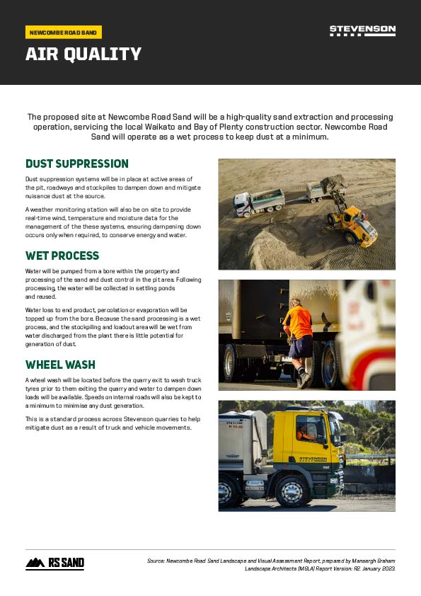 RS Sand Ltd is 100% owned by Stevenson, a business with more than a century of experience that operates two sand quarries, five hard rock quarries and four ready mix concrete plants in the Upper North Island. Standing behind Stevenson is its owner – Fulton Hogan, a leading civil construction and infrastructure contractor in NZ and AU with over 90 years’ experience and extensive sand and rock quarrying experience.
