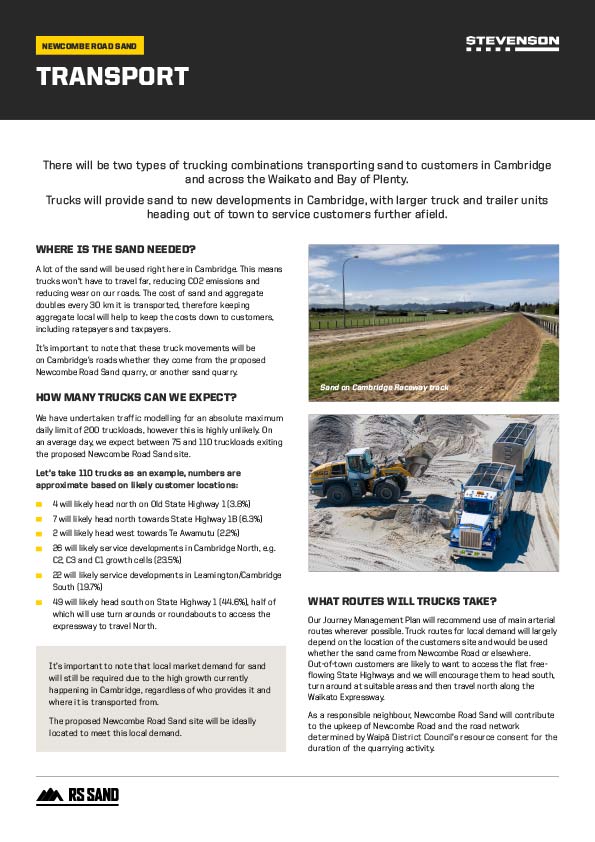 Truck routes will be determined by the individual driver upon exiting the proposed Newcombe Road Sand Quarry. The location enables truck traffic to be split over a number of arterial routes, avoiding excessive numbers on any one route. A significant number of the truck movements will be servicing the Cambridge North and South growth cells. These truck movements will occur on Cambridge roads whether the sand is sourced from Newcombe Road Sand or elsewhere. As a responsible neighbour, the proposed Newcombe Road Sand Quarry will contribute to the upkeep of Newcombe Road, and other key intersections or roads determined by Waipa District Council’s resource consent for duration of the resource consent.